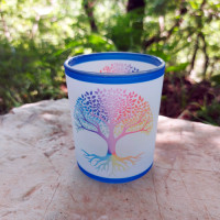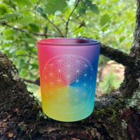 These frosted glass tealight holders decorated with sacred geometry symbols are printed by us in our workshop.